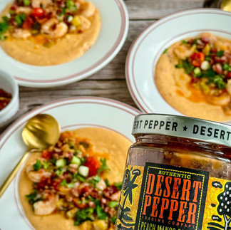 Buttery fresh tomato shrimp scampi gains sweet heat with Desert Pepper Medium Peach Mango Salsa! The grits become cheesier and creamier with Desert Pepper Medium Chile Con Queso along with a spike of heat thanks to Desert Pepper Cantina Medium Red Salsa!
