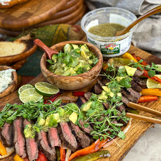 To present: Arrange Salsa Verde Peppers on a cutting board or large serving platter, leaving a space in the center for the beef. Fan sliced flank steak down the center, and spoon Avocado Salsa Verde like a stream running down the center of the meat. Dollop with Salsa Verde Goat Cheese, and sprinkle with cilantro micro-greens. Serve with lime slices. Serves 6.