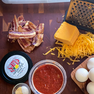 COMBINE Sam’s Cantina Style Salsa, hash browns, cheddar cheese, bacon, salt, and granulated garlic. Pat onto the bottom and up the sides of the prepared pan. Place pan into freezer for 30 minutes or if needed overnight.